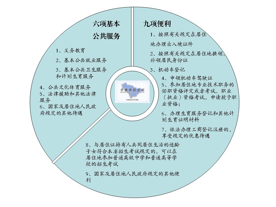 居住证是持证人在居住地居住,作为常住人口享受基本公共服务和便利、申请登记常住户口的证明。《办法》从为流动人口享受居住地基本公共服务和便利出发,积极提升居住证的“含金量”,规定了居住证持有人享受六项基本公共服务和九项便利。六项基本公共服务涵盖了义务教育、基本公共就业服务、基本公共卫生服务和计划生育服务、公共文化体育服务、法律援助和其他法律服务、国家及居住地人民政府规定的其他待遇等。九项便利包括了按照有关规定在居住地办理出入境证件,按照有关规定在居住地换领、补领居民身份证,机动车登记,申领机动车驾驶证,参加居住地专业技术职务的任职资格评定或者考试、职业(执业)资格考试申请授予职业资格,办理生育服务登记和其他计划生育证明材料,依法办理工商登记注册的享受规定的优惠待遇,与居住证持有人共同居住生活的适龄子女符合本省招生考试规定的,可以在居住地参加普通高级中学和普通高等学校的招生考试,国家及居住地人民政府规定的其他便利等内容。